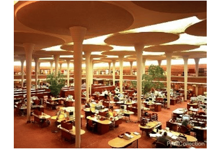 The large work area at the Johnson Wax Building, headquarters of the S.C. Johnson and Son Co., Racine, Wisconsin
